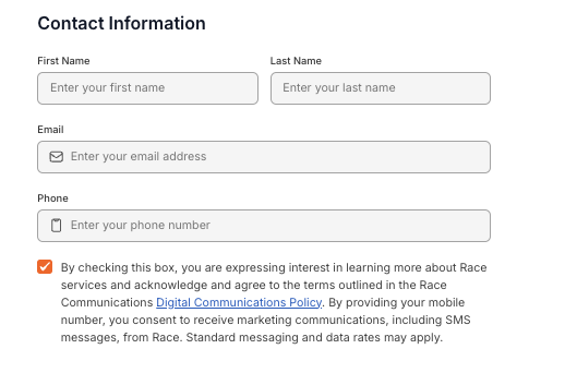 You’ll also see a checkbox that lets you consent to receive communication from Race Communications. Checking it allows us to send you updates, including optional marketing messages.