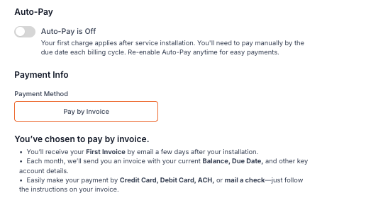 If Auto-Pay is off, you’ll pay manually each month once your service begins.