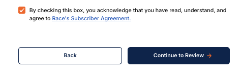 Before moving to the final review step, you must check the box to confirm that you’ve read and agree to Race’s Subscriber Agreement. This is required to complete your order.